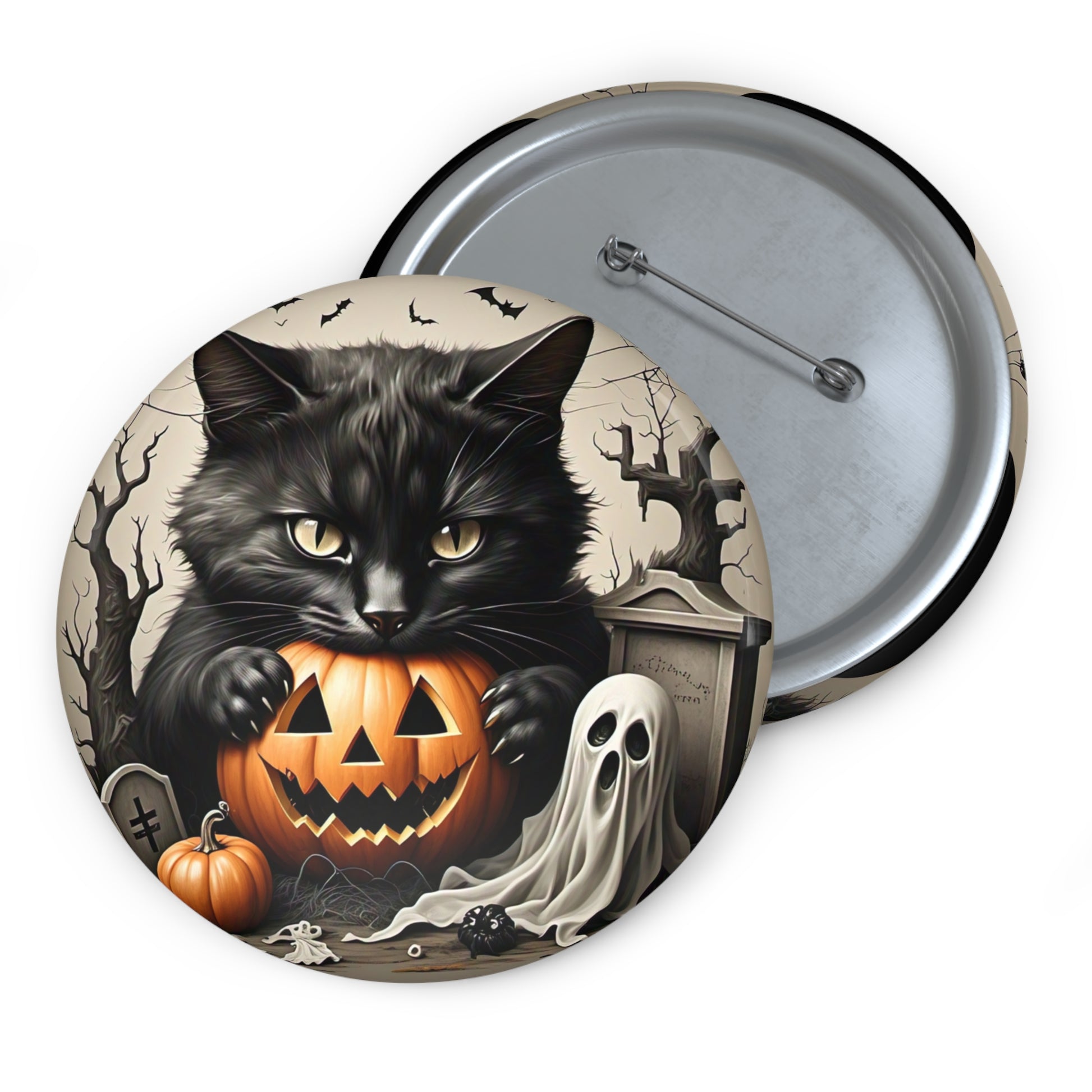 This Halloween black cat themed pin button exudes a spooky and festive vibe, perfect for Halloween enthusiasts looking to add a touch of Halloween spirit to their outfit or accessories. Ideal for Halloween parties, trick-or-treating, and costume events.