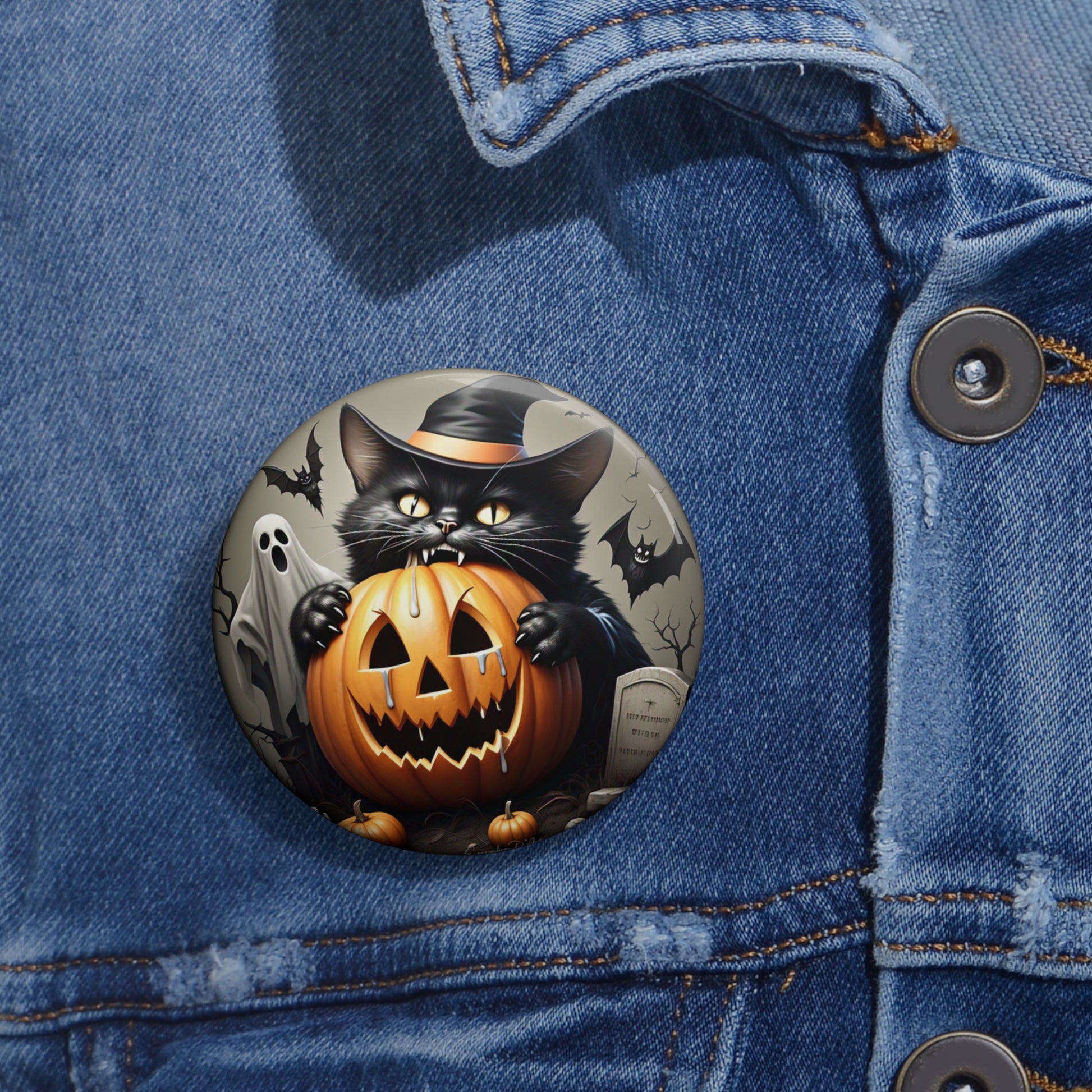 This Halloween Pumpkin Vintage Witch bat grave black cat themed pin button exudes a spooky and festive vibe, perfect for Halloween enthusiasts looking to add a touch of Halloween spirit to their outfit or accessories. Ideal for Halloween parties, trick-or-treating, and costume events.