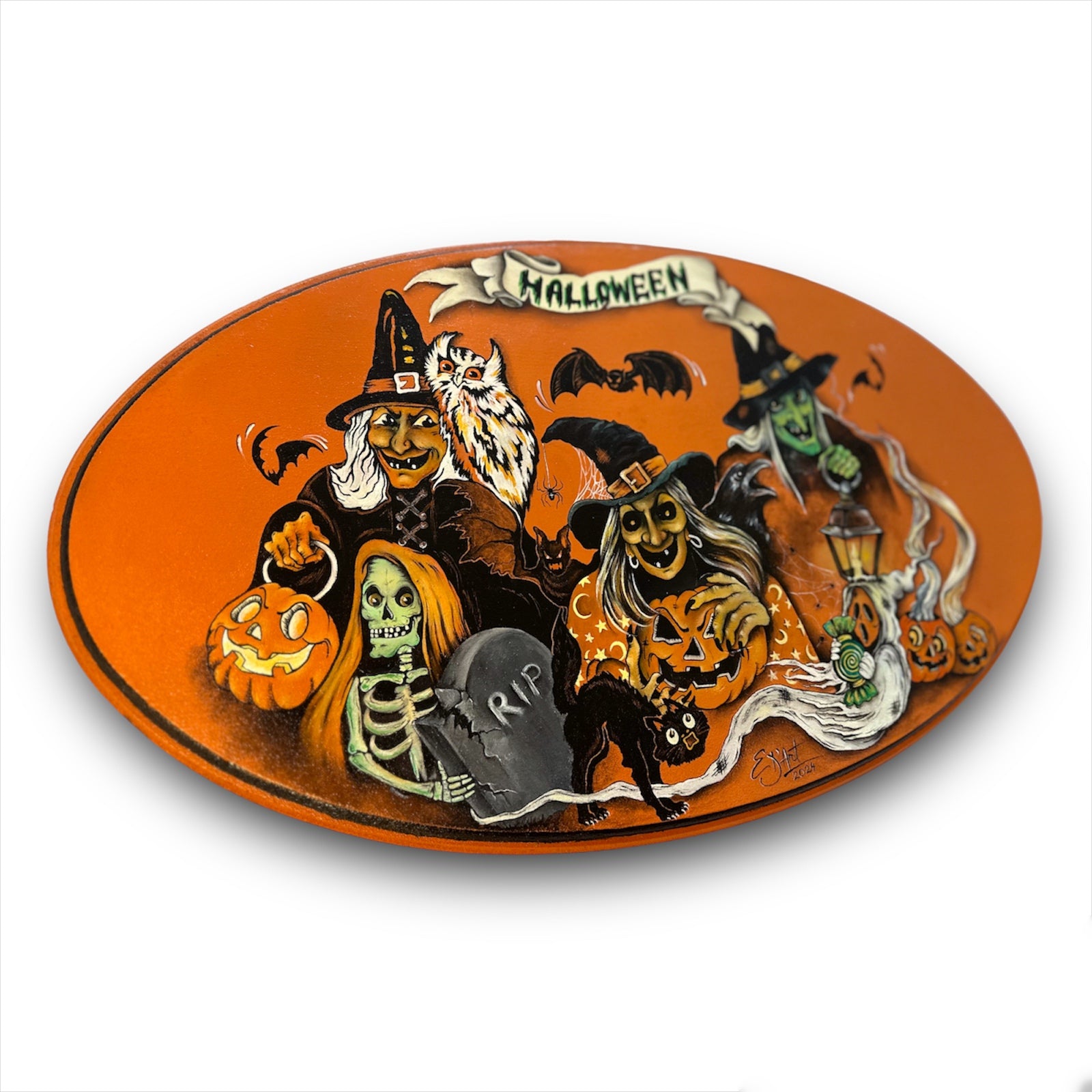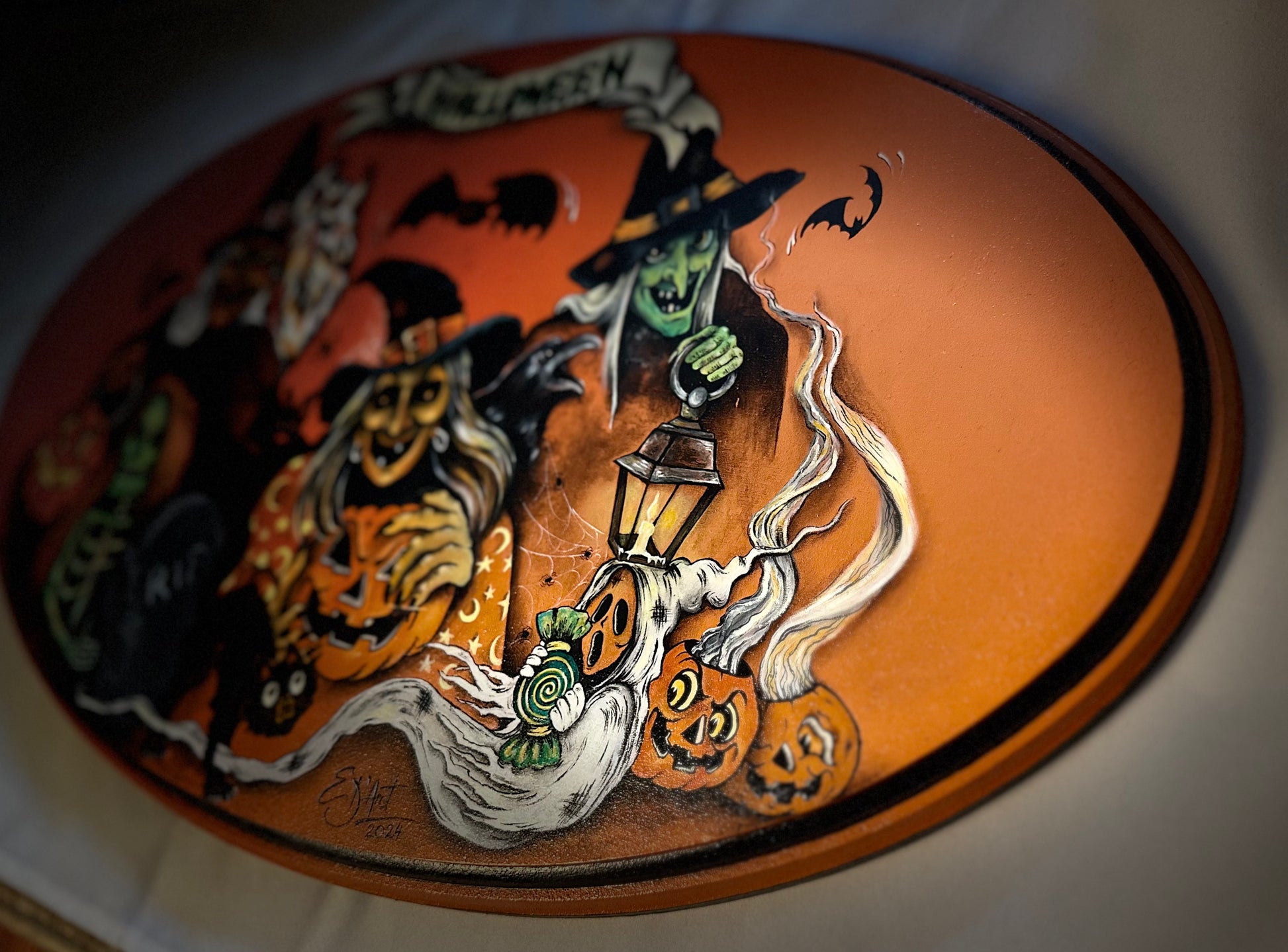 Equipped with hooks and executed on authentic wood substrate, the vintage-inspired artwork showcases meticulous brushwork and period-appropriate aesthetics that command attention within any interior setting. Whether you're searching for a remarkable Halloween gift or looking to enhance your own space, this sign is an ideal choice. Its timeless appeal and nostalgic vibes will bring a touch of enchantment to any room and it represents a significant statement piece for discerning collectors and design-conscious homeowners. The generous dimensions allow the piece to function as a primary focal point and the weathered finish and carefully rendered Halloween imagery establish sophisticated seasonal appeal while maintaining year-round visual relevance. An investment-quality decorative element for those seeking authentic, museum-quality artistry in their home environment.